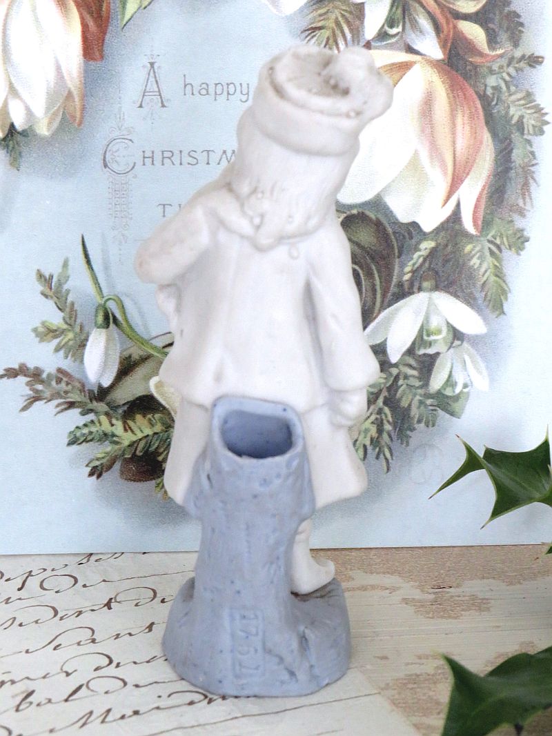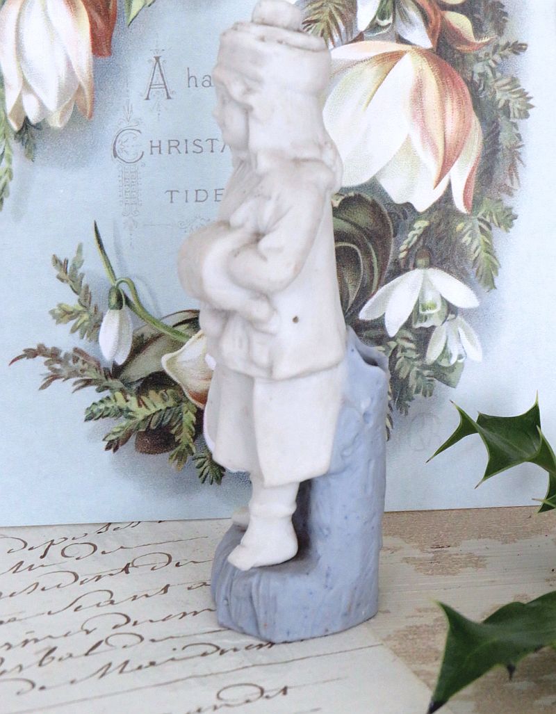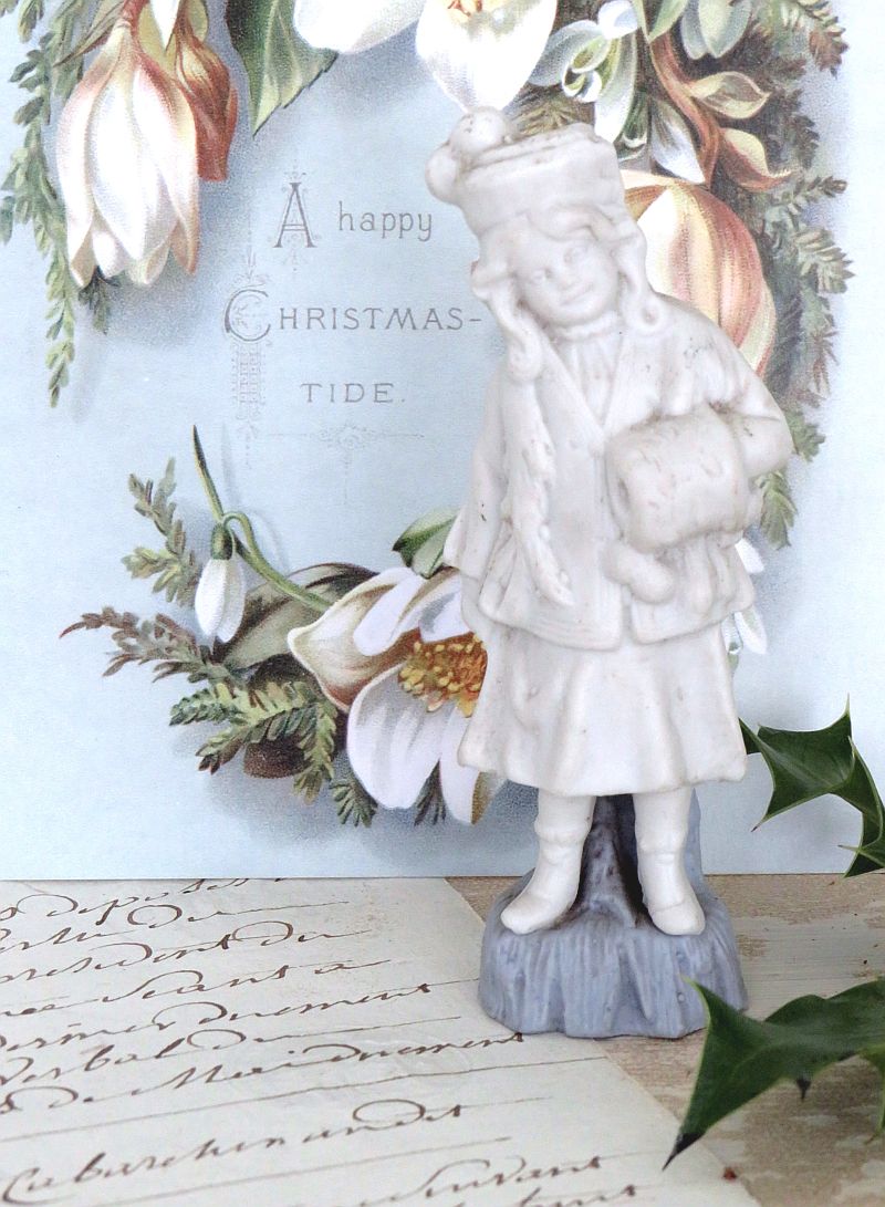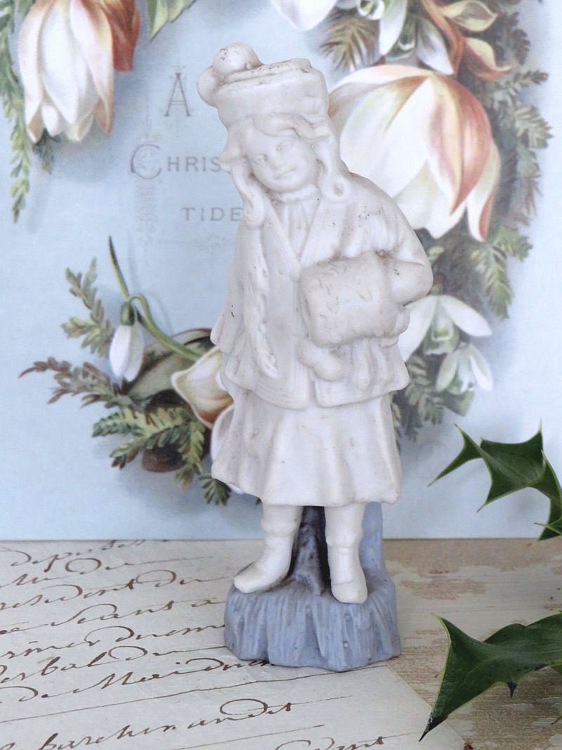 Antiek Frans biscuitbeeldje van een meisje met winterkleding, hoedje en moffen.