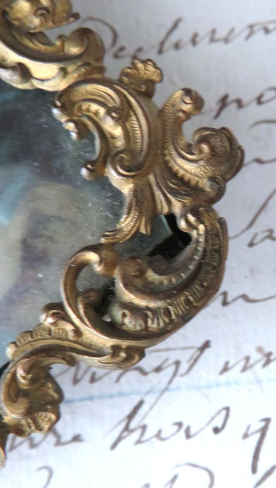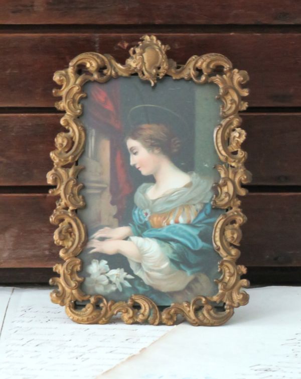 Het lijstje heeft een bewerkte rand, glas en een antiek prentje.