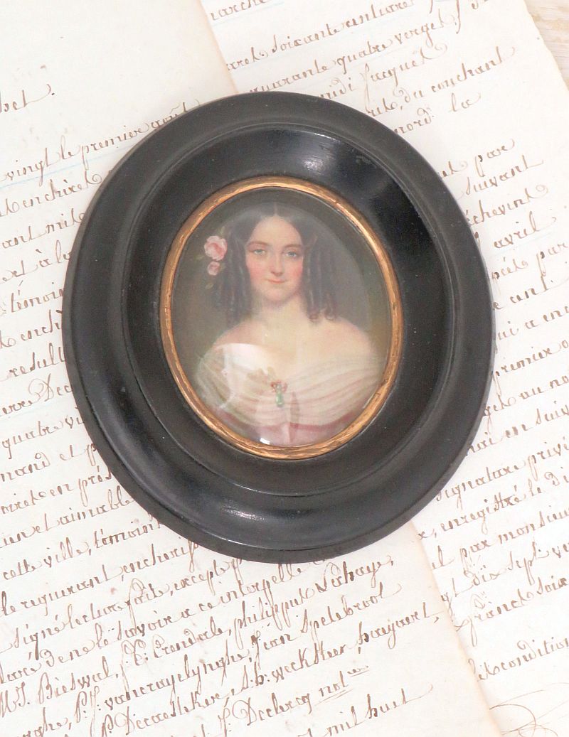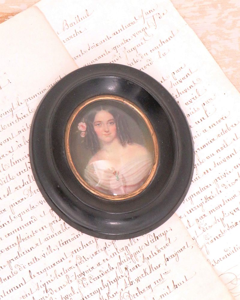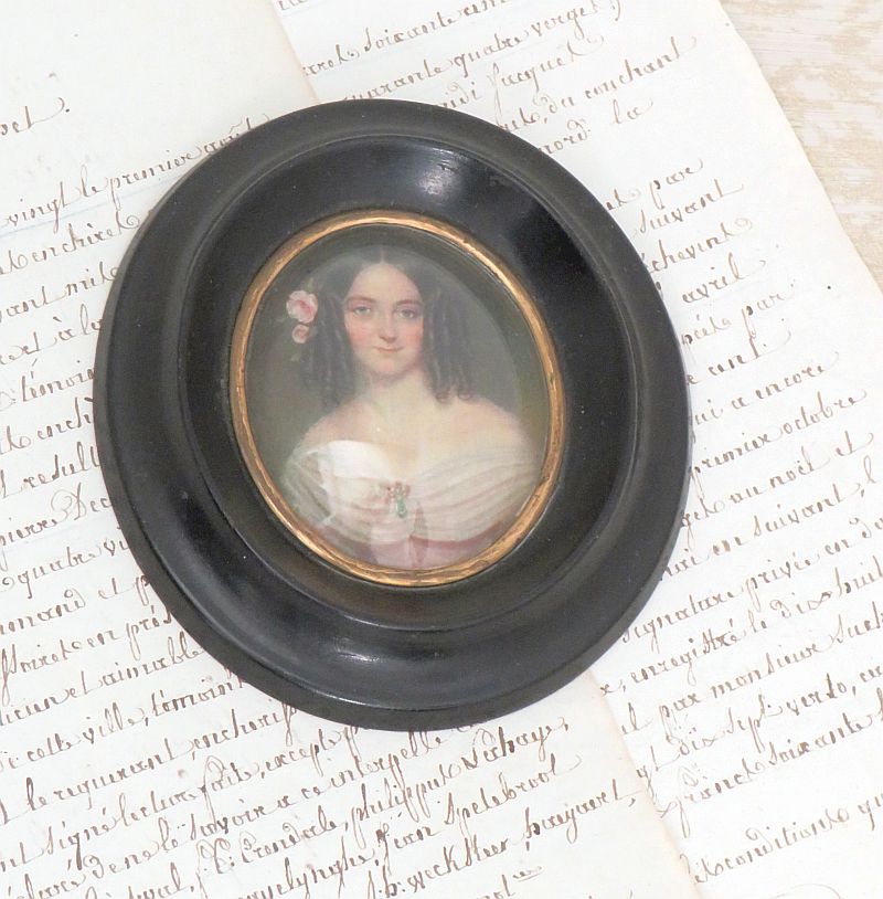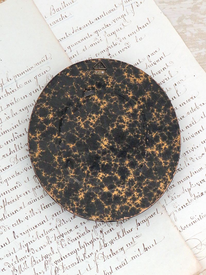 Antiek ovaal Frans houten lijstje met messing randje en bolglas.