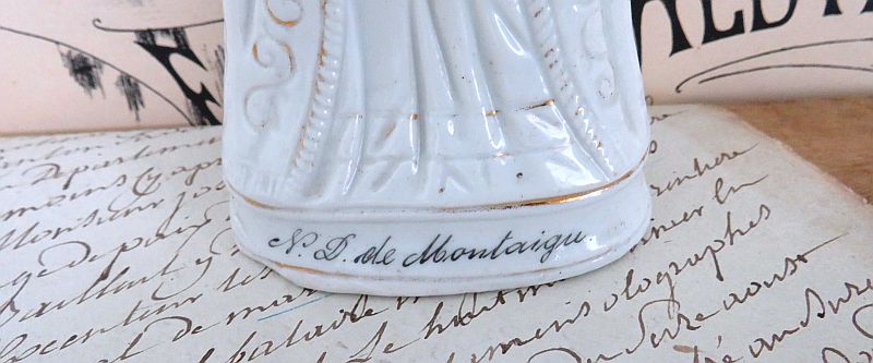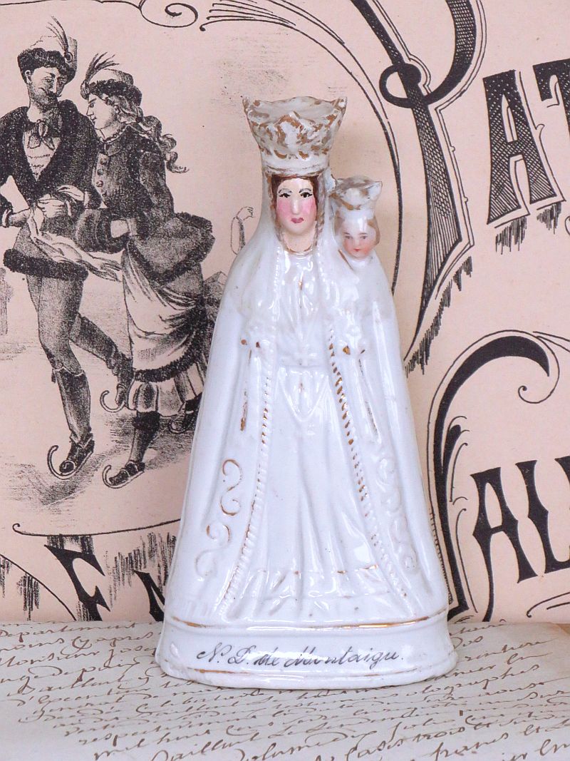 Antiek zwaar Frans porseleinen beeldje “Notre Dame de Montaigu”.