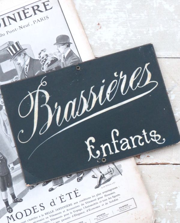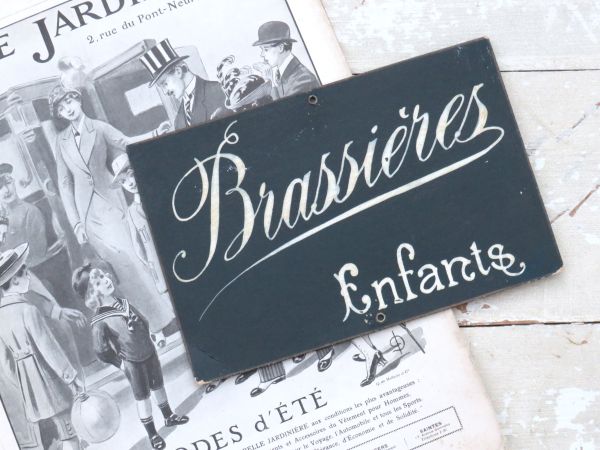 Antiek Frans winkelbordje “Brassieres – Enfants”, circa 1900.