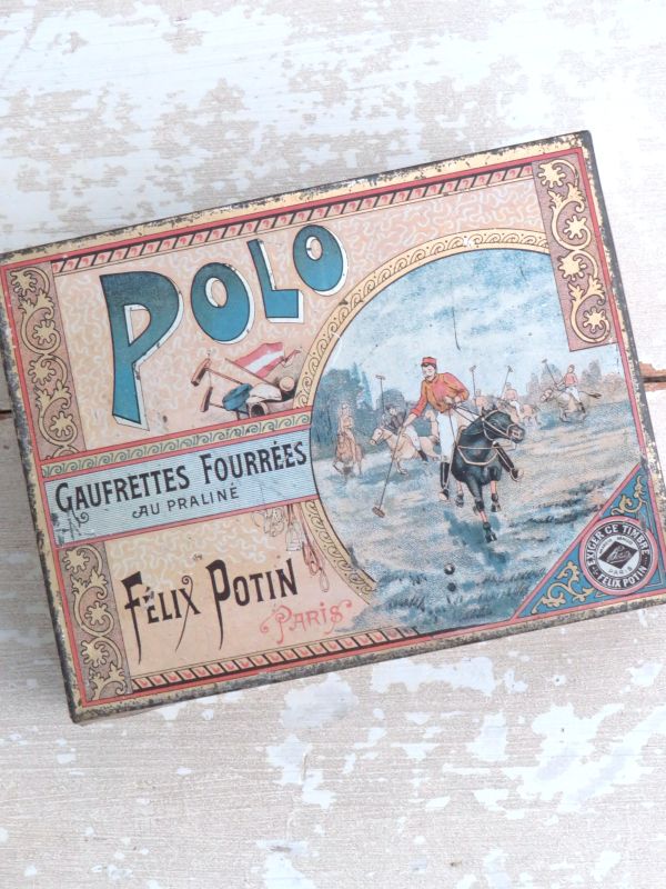 Antiek koekjesblik Félix Potin Paris, Gaufrettes Fourrées “Polo”.
