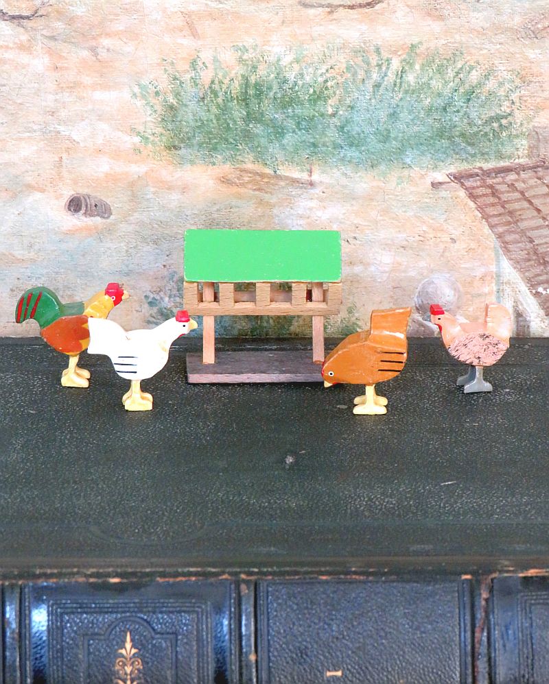 De set bestaat uit een haan, 2 kippen, een kuiken en een voederbak.