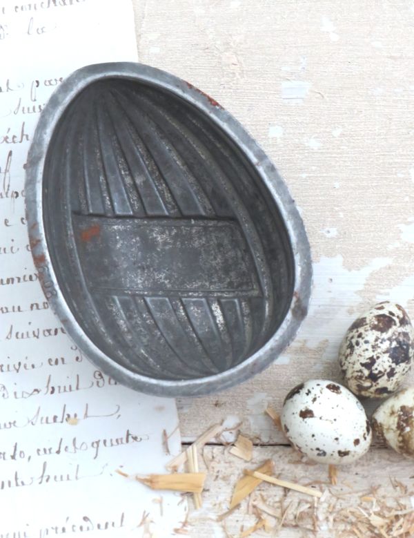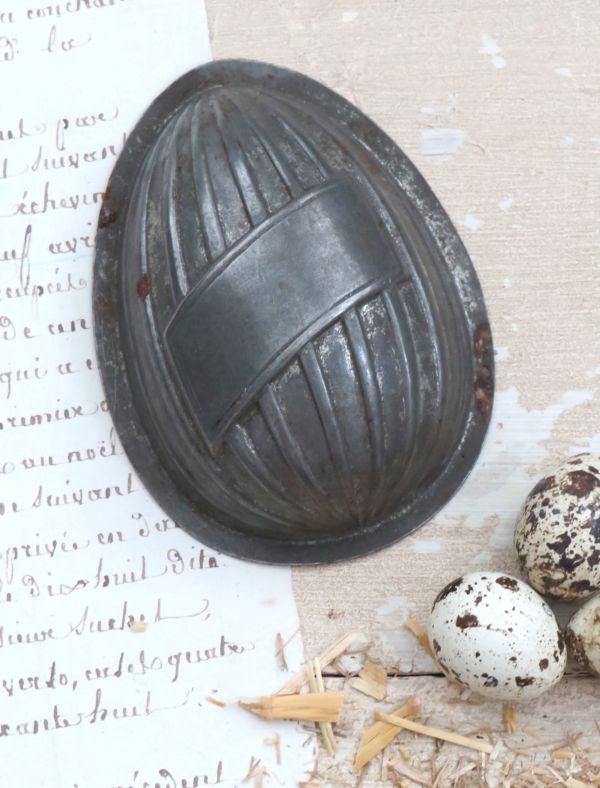 Antieke metalen chocoladevorm ” Gestreept paasei met etiket”.