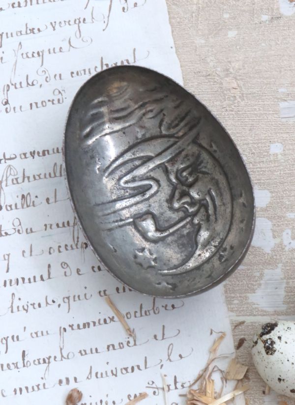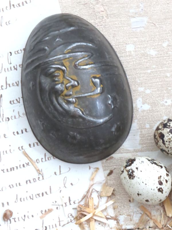 Antieke metalen chocoladevorm “Maan met pijp en sterren”.