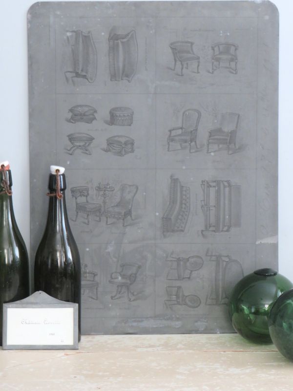 Antieke Franse zinken ets-/ lithoplaat met illustraties van stoelen en banken.