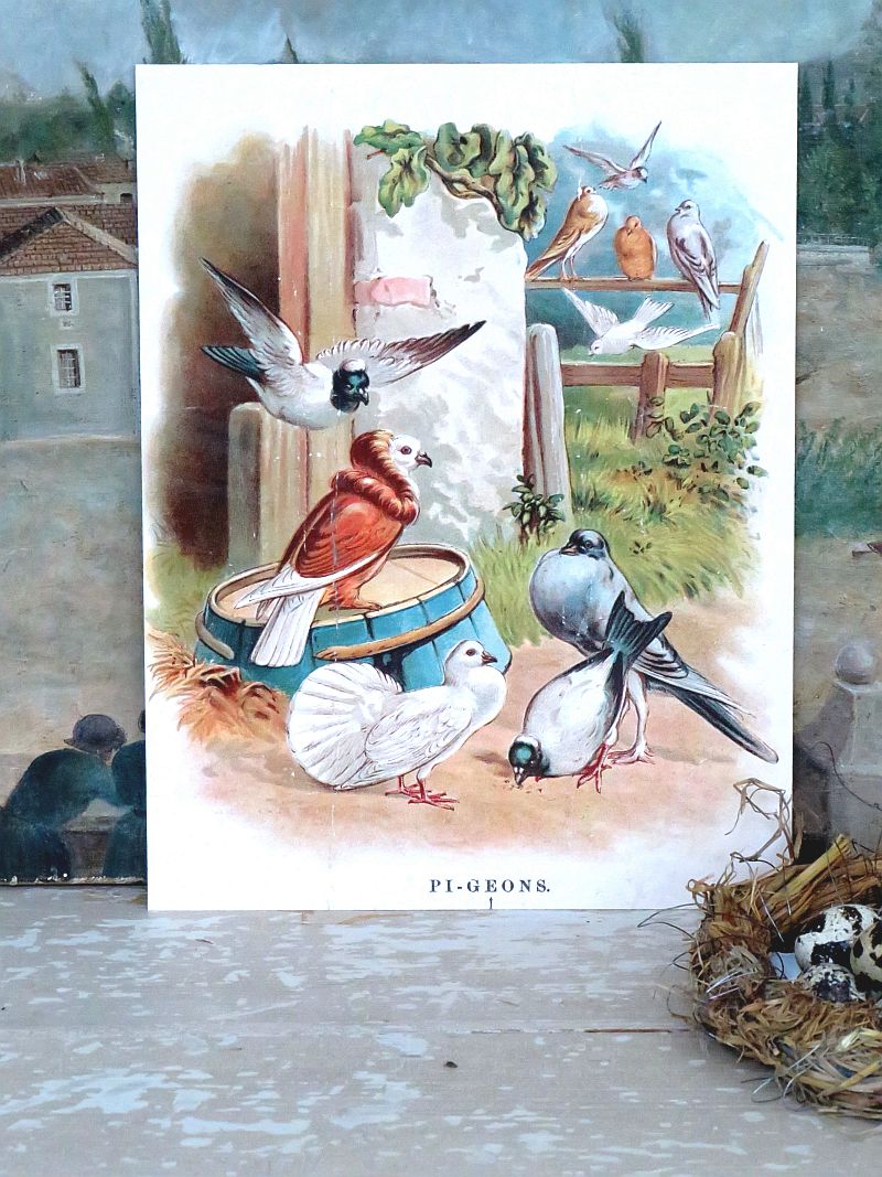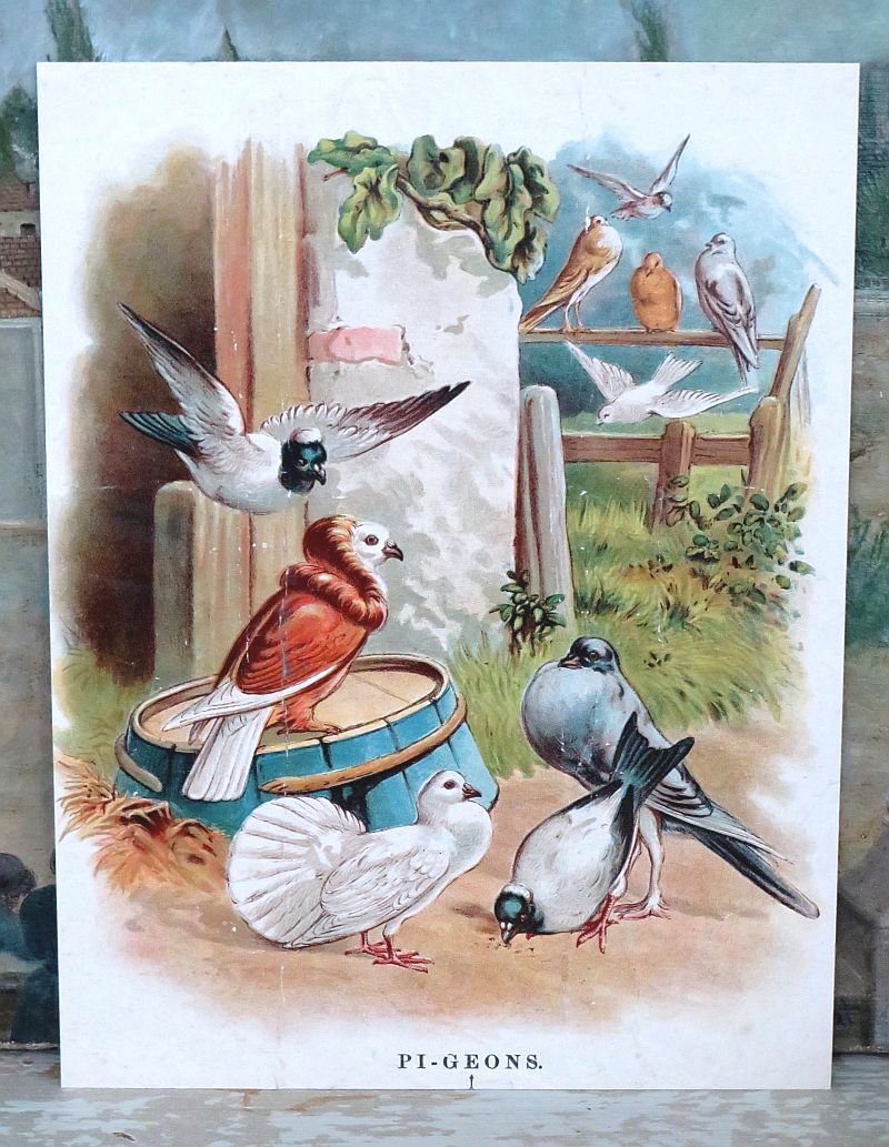 Antieke Franse lithografische prent “Pi-Geons” ( Duiven).
