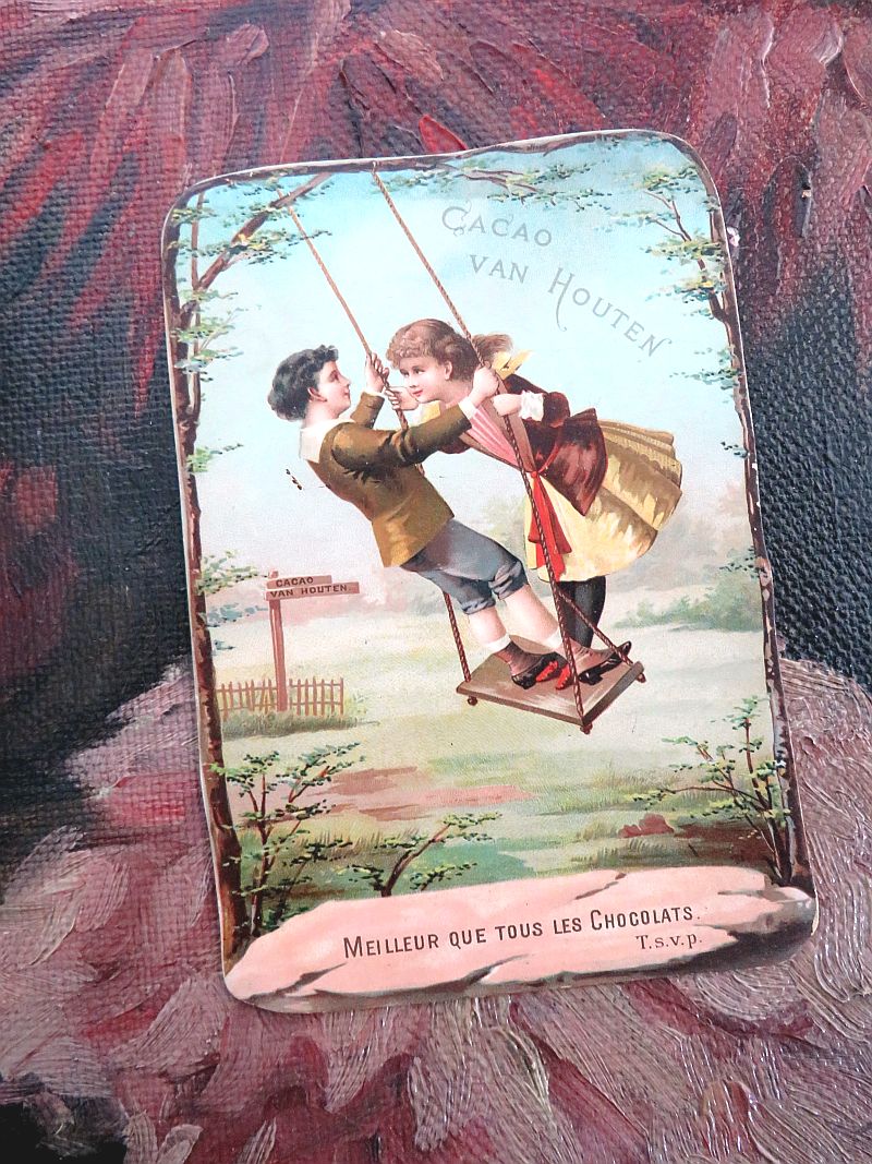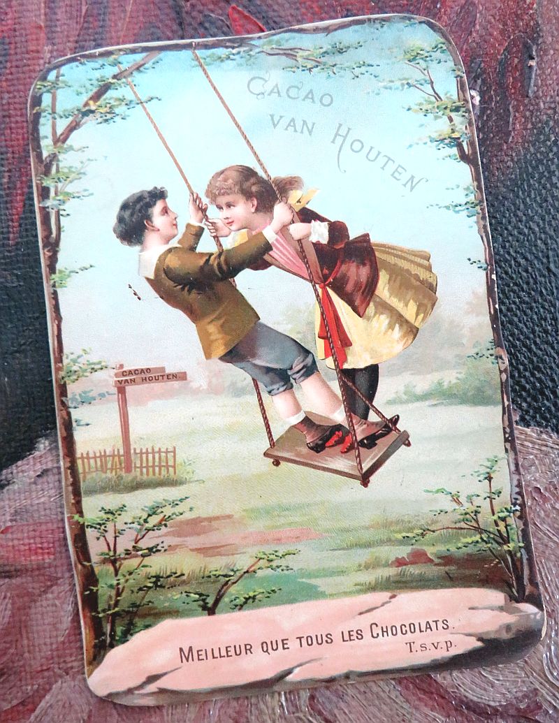 Lithografische afbeelding op karton van 2 schommelende kinderen.