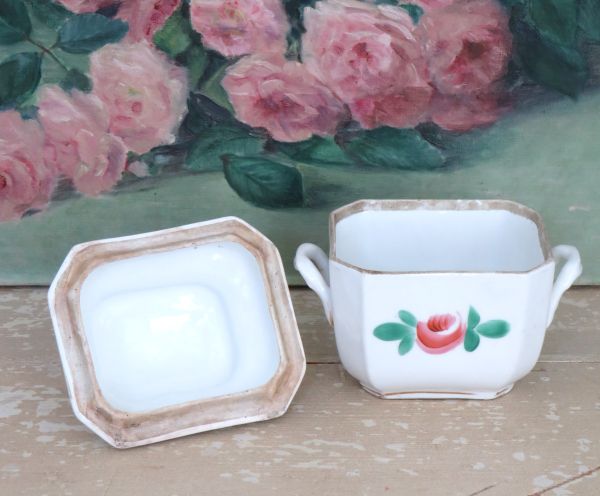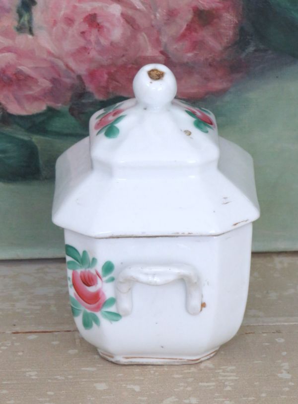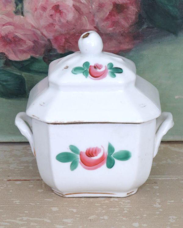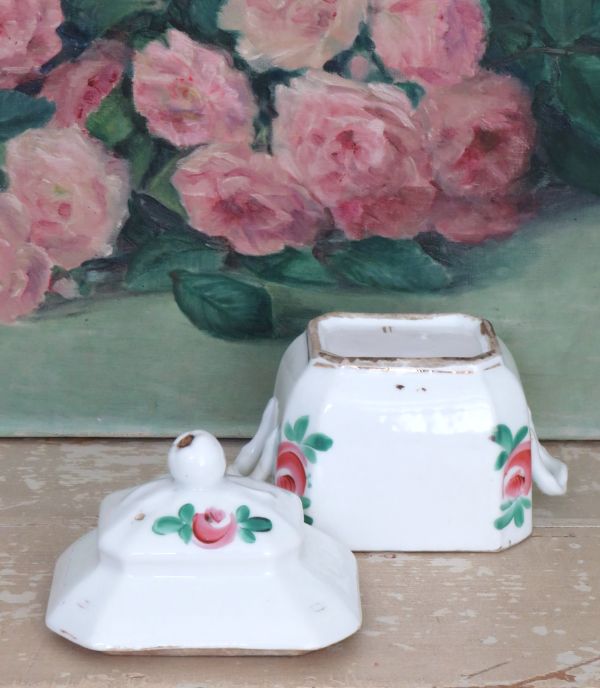 Antieke Franse suikerpot met handbeschilderde roosjes.