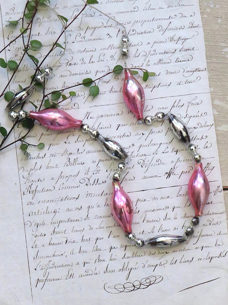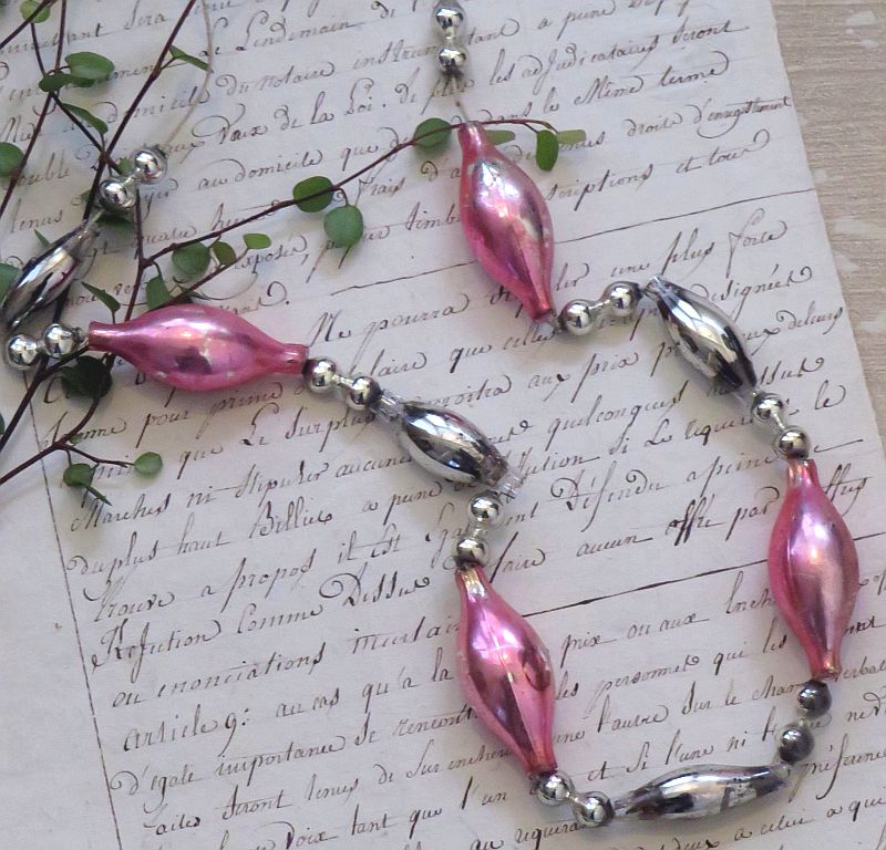 Antieke kerstboomketting met grote roze en zilverkleurige kralen.