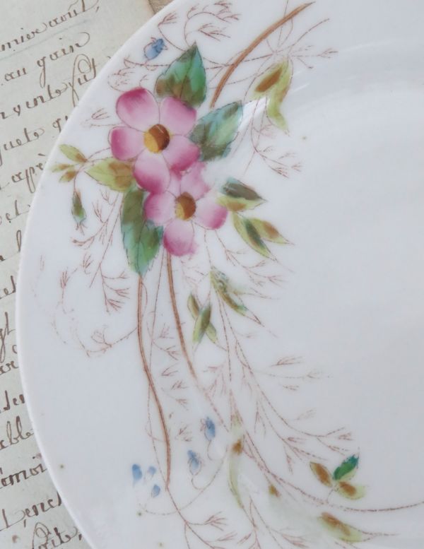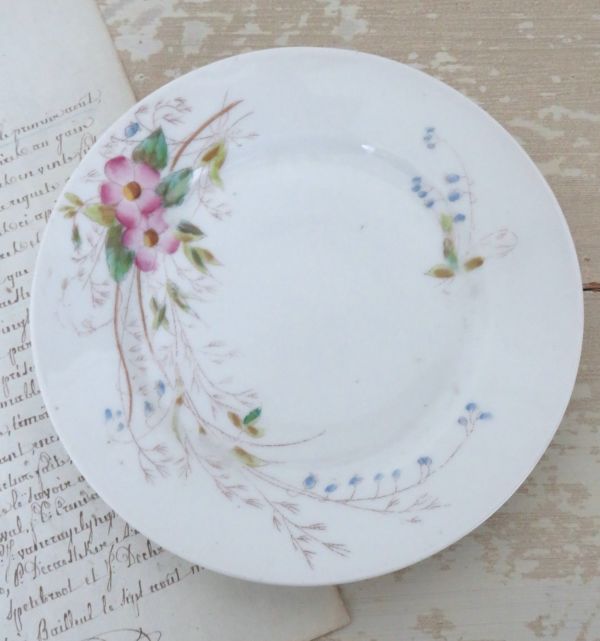 Oud Frans handbeschilderd porseleinen bordje met een boeketje van bloemen en grassen.