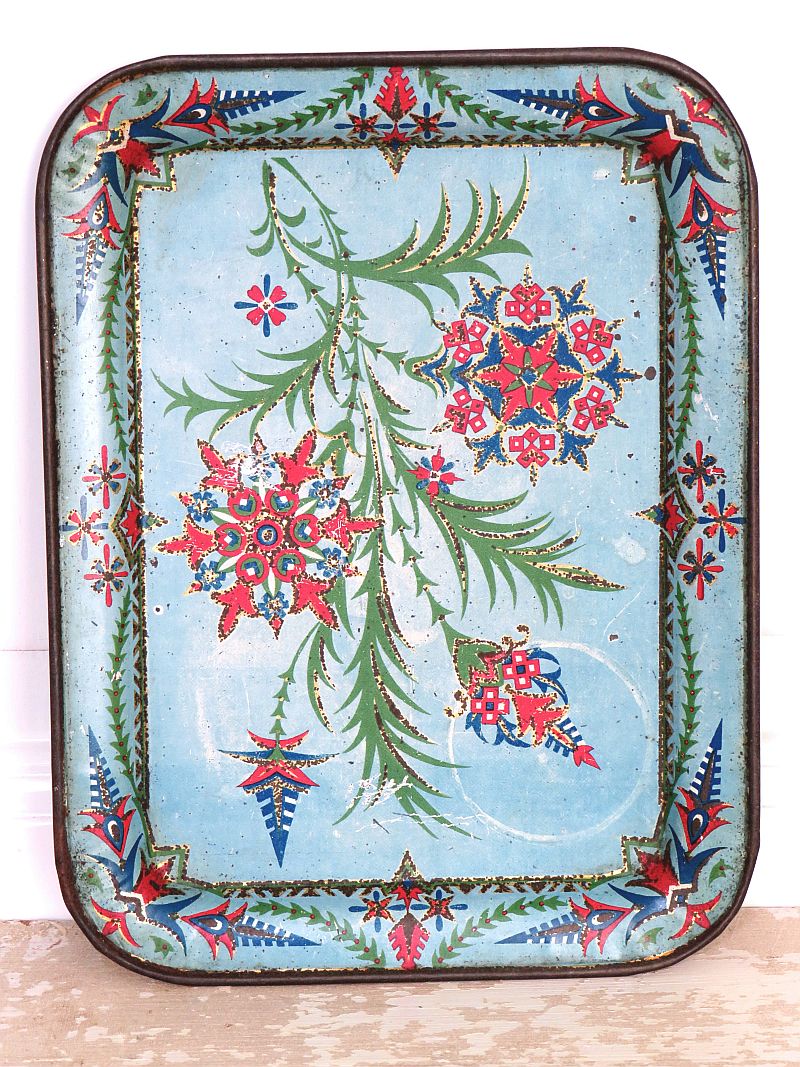 Het lichtblauwe dienblaadje is gedecoreerd met rood, blauw, groen en goud.