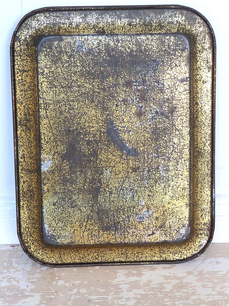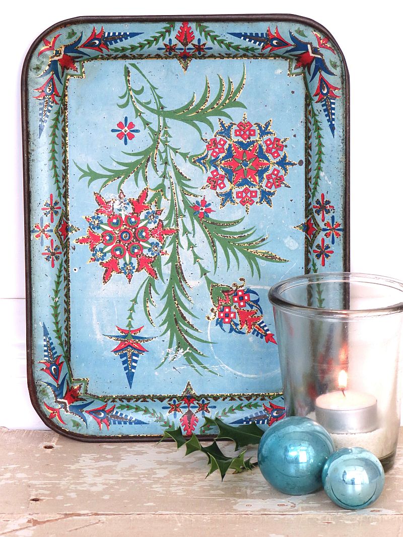Oud metalen dienblaadje met een prachtige kerstdecoratie.