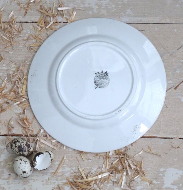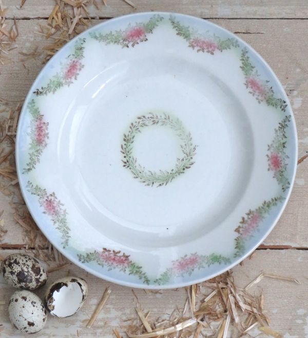 Oud bordje van Boch La Louvière gedecoreerd met een kransje en guirlandes in pasteltinten.