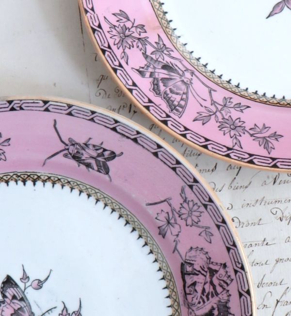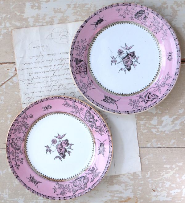 Oud bordje gedecoreerd met vlinders en torretjes.