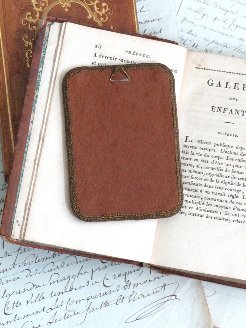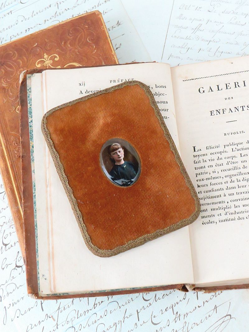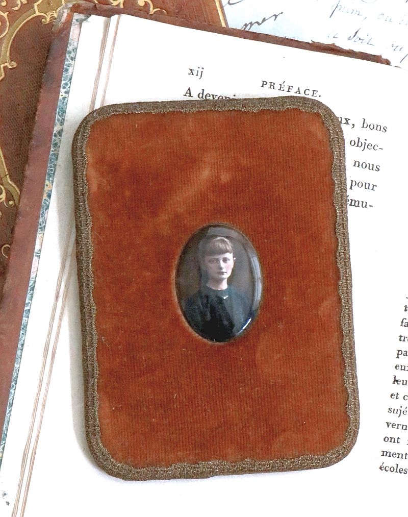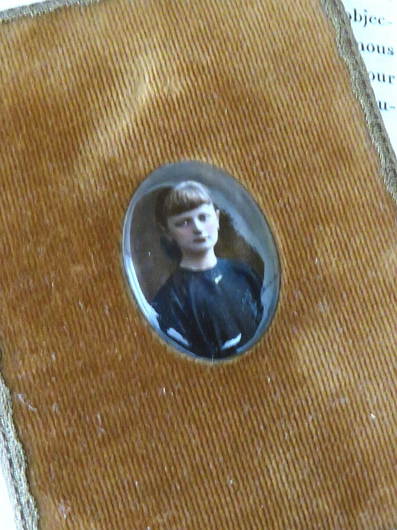 Oud fluwelen lijstje met een fotomedaillon (glas of porselein).