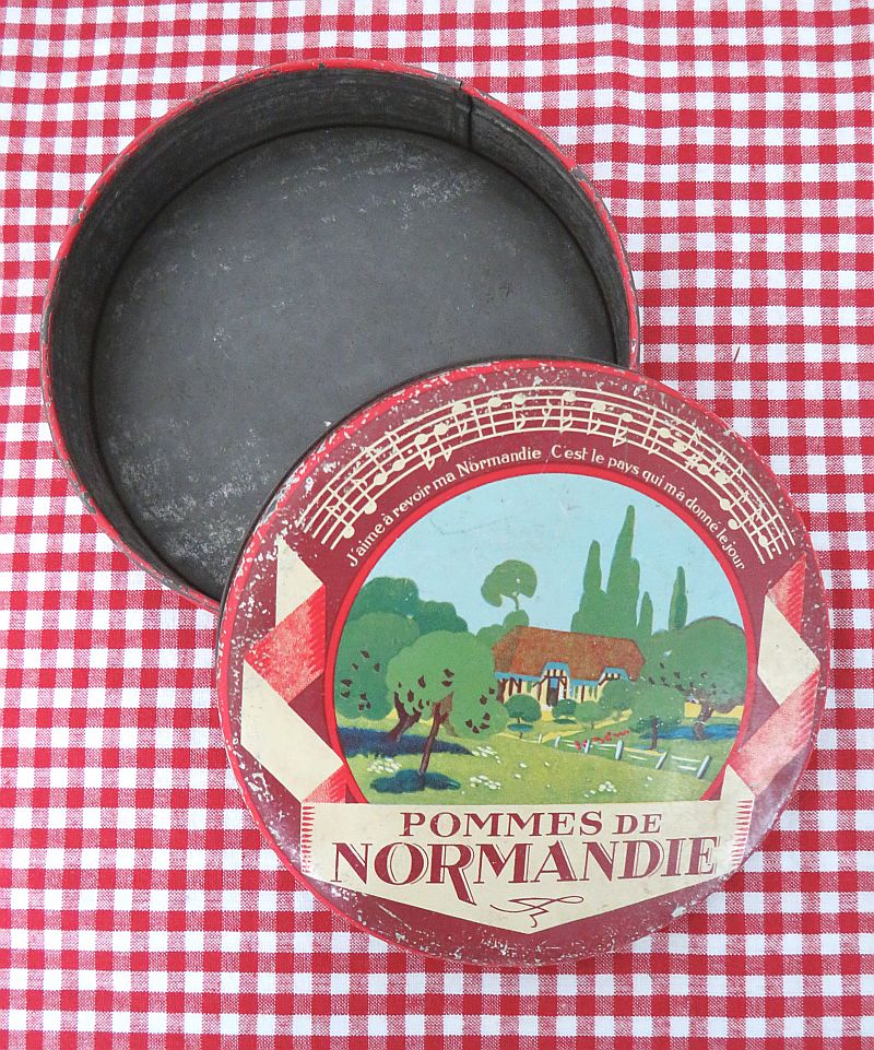 Het blik is mooi gedecoreerd (o.a. appeltjes aan de zijkant), de binnenkant is mooi vertind.