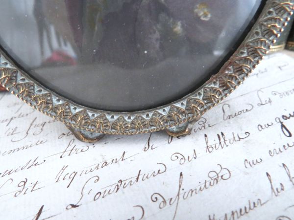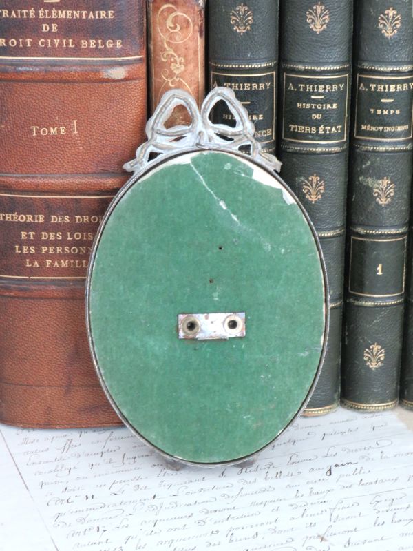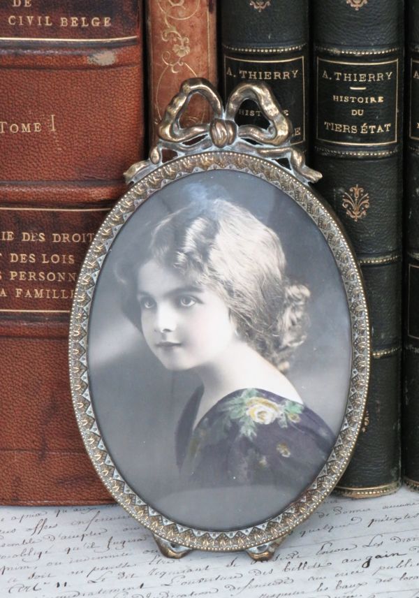 Oud messing fotolijstje met strikje uit Frankrijk.