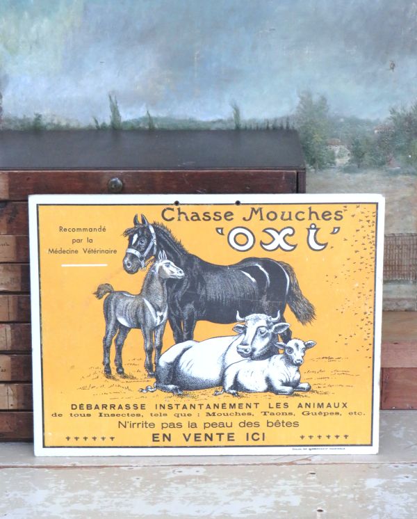 Oud kartonnen Frans reclamebord “Chasse Mouches Oxi”.