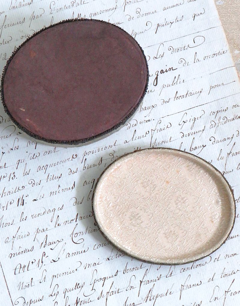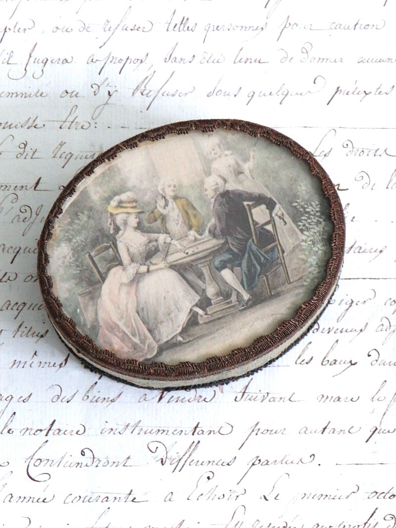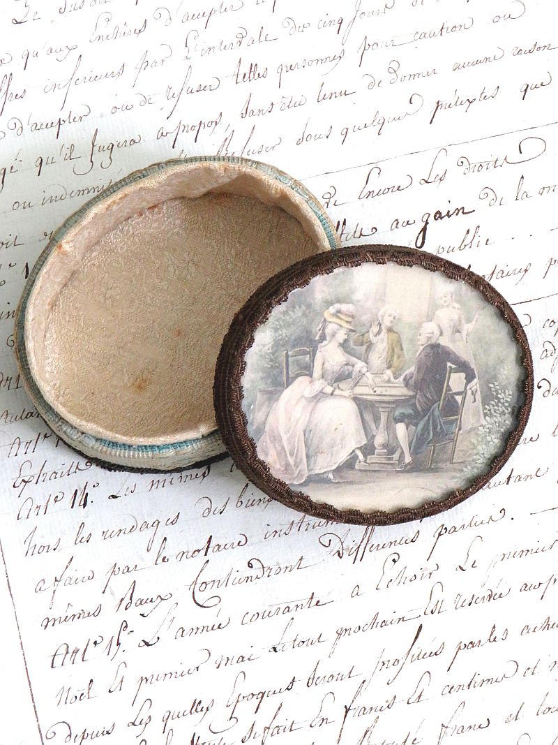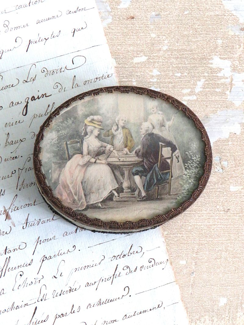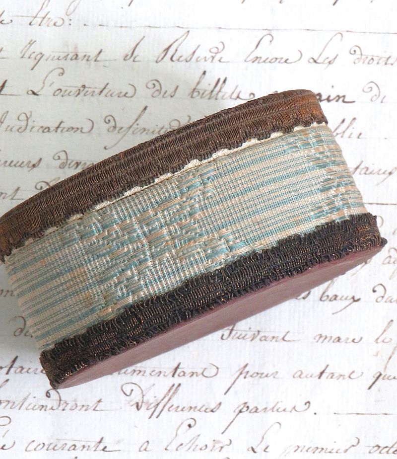 Oud Frans stoffen sieradendoosje met glazen deksel.