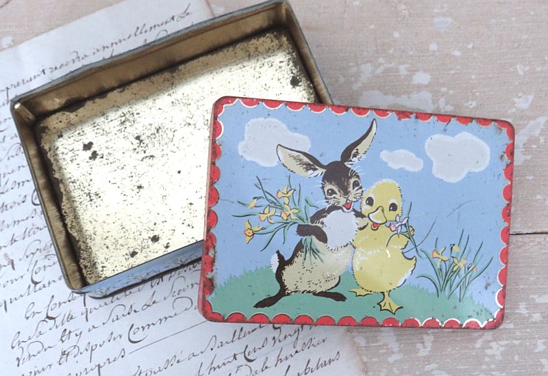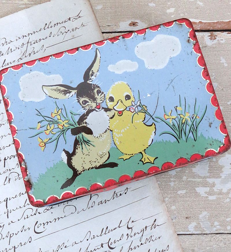 Oud paasblik “Paashaas, kuiken en narcissen”.