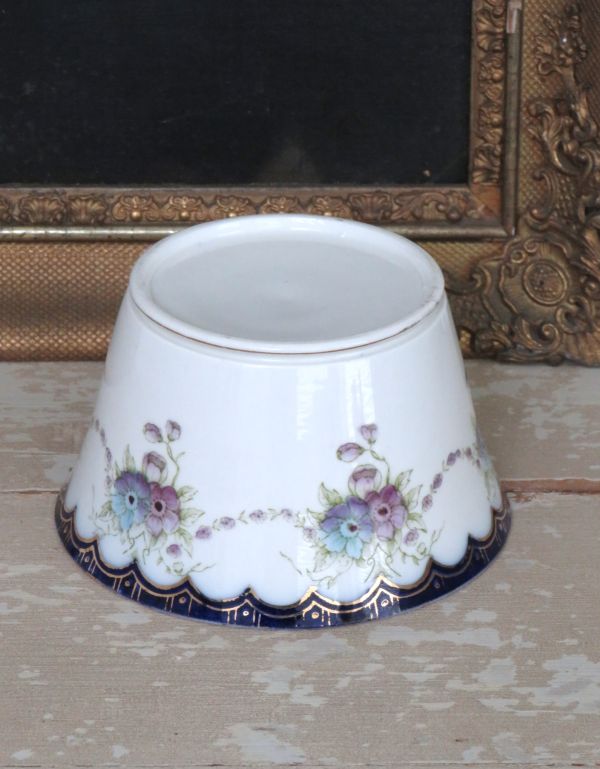Oud porseleinen schaaltje met lichtblauwe en violetkleurige bloemen.