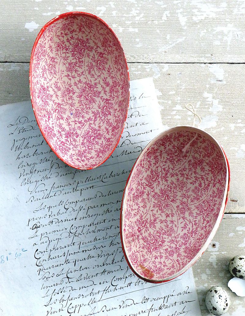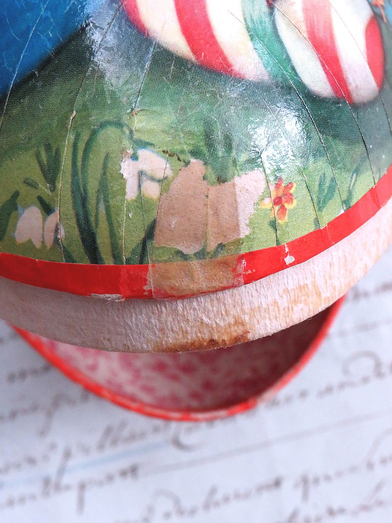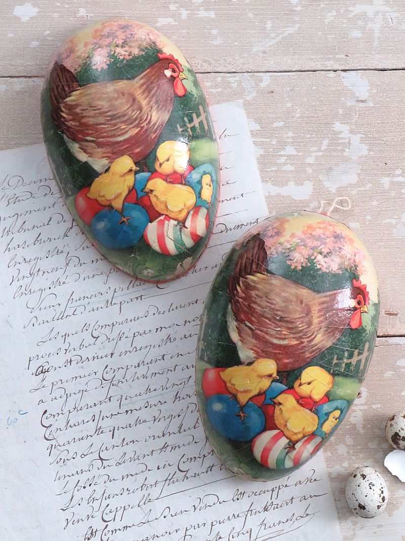 Oude candycontainer met aan beide kanten een decoratie van een kip, kuikentjes en eieren.