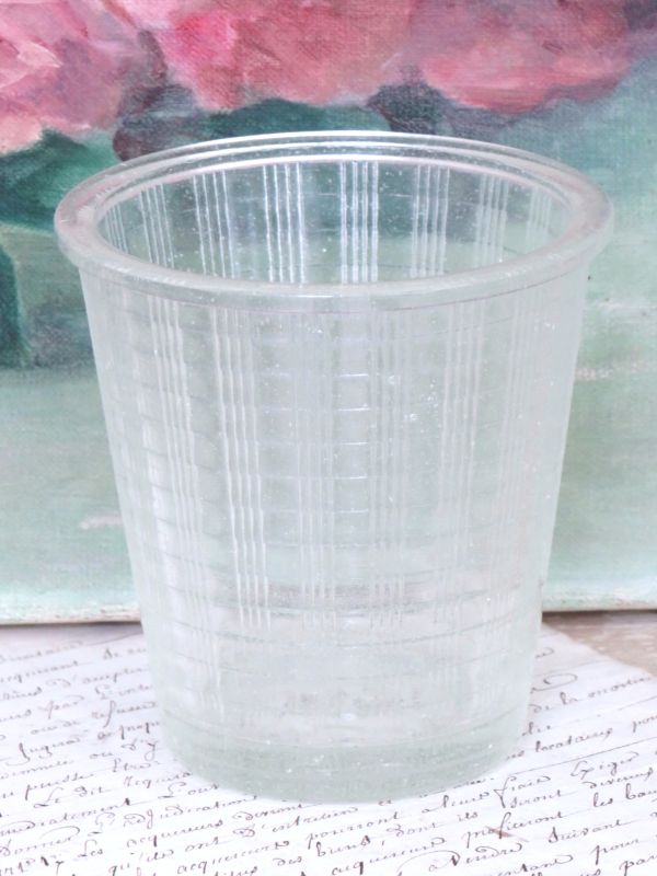Het glas heeft een streepjes-/ blokjesmotief.