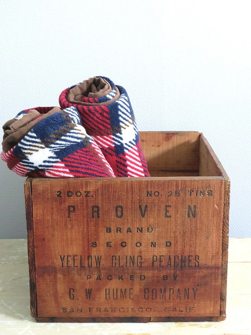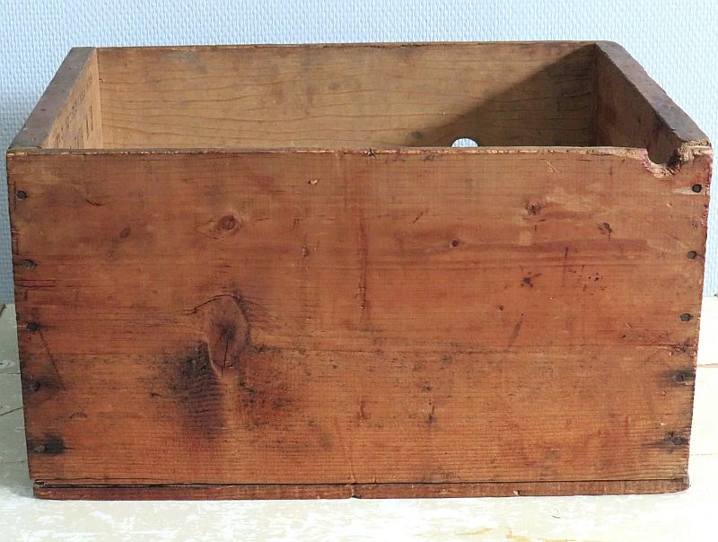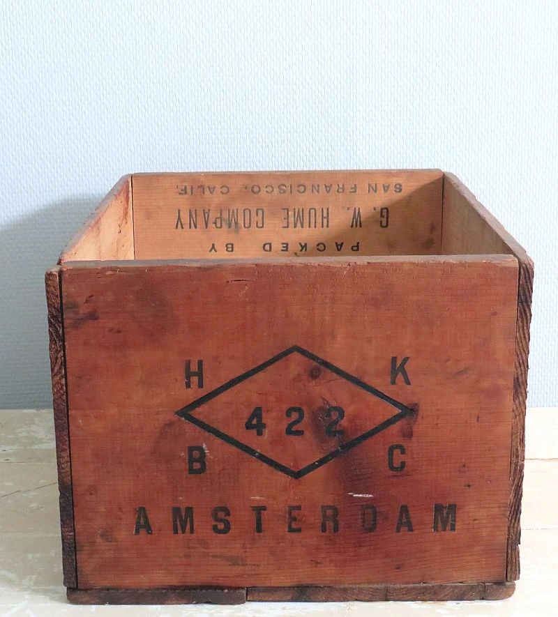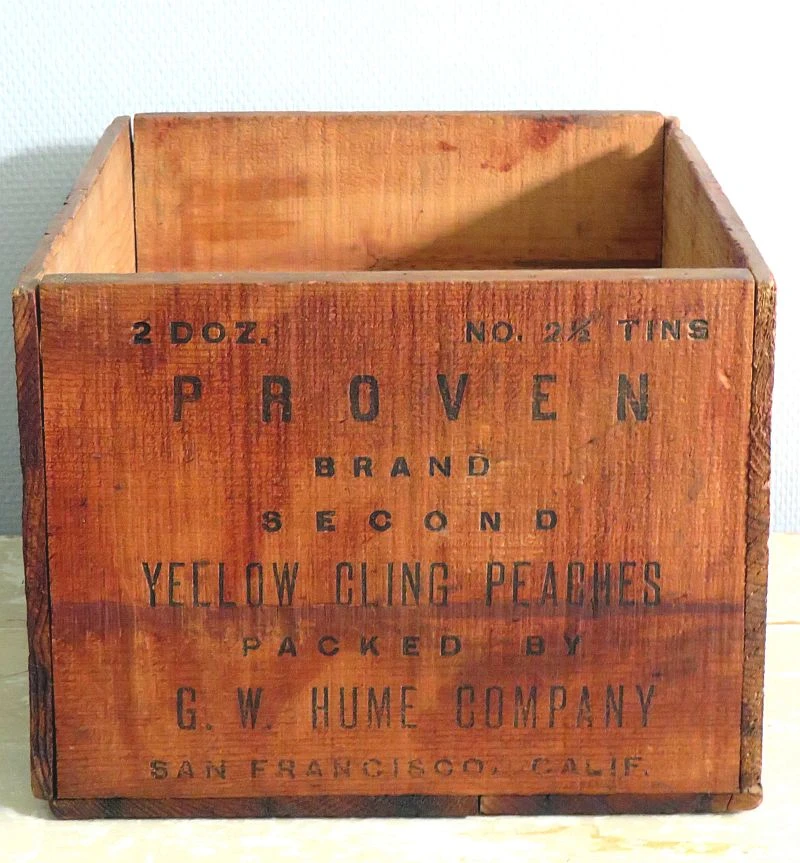 Oude houten kist met tekst: Proven Brand Yello Cling Peaches – San Francesco California.