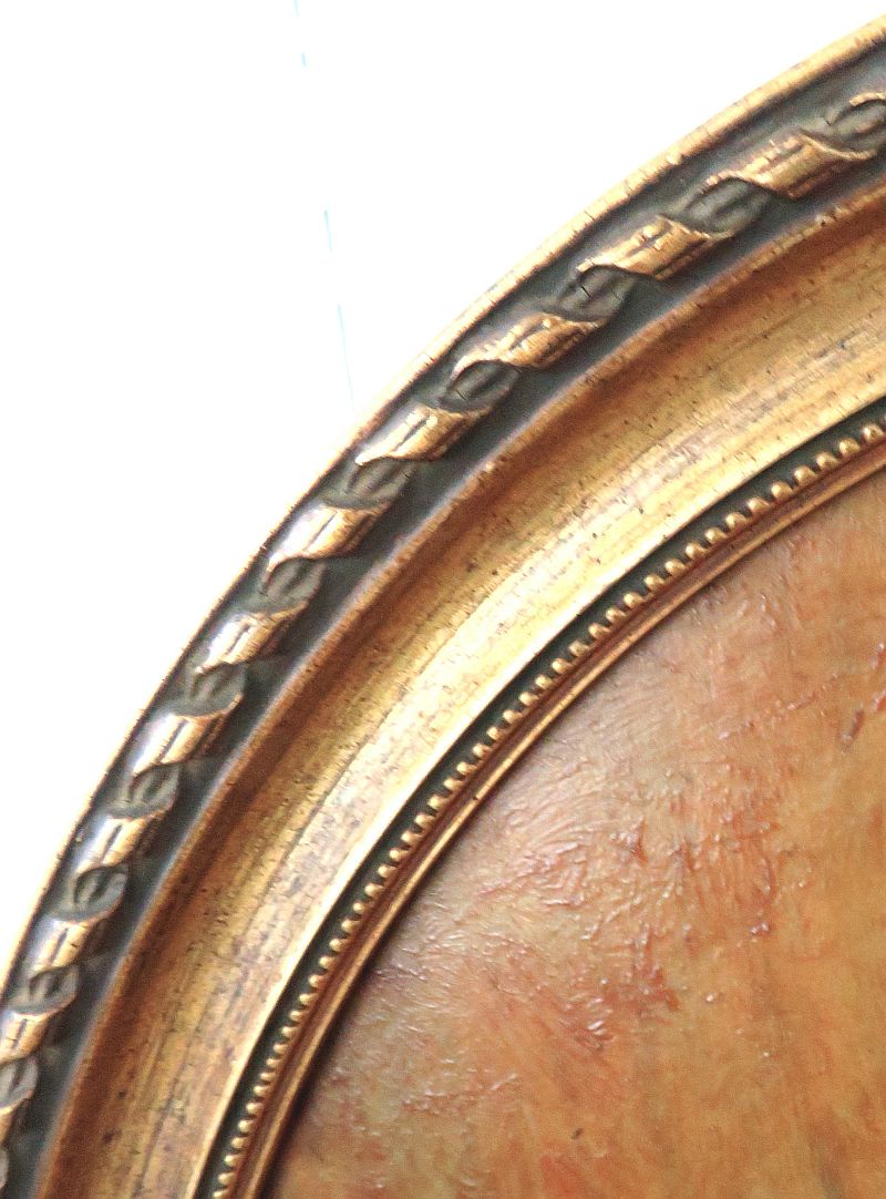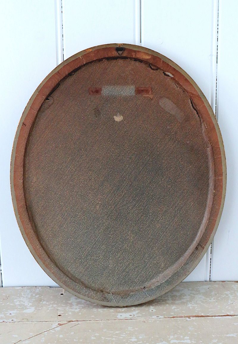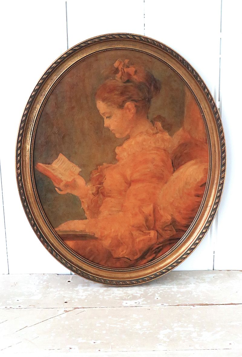 Oude ovale lijst met een oleografie van een lezende dame in goudtinten.