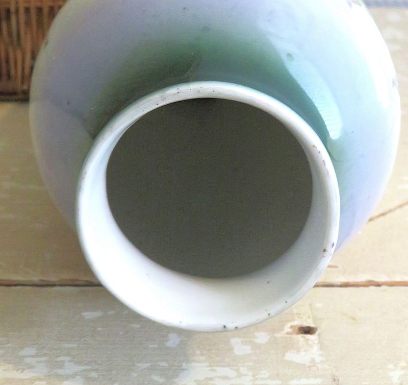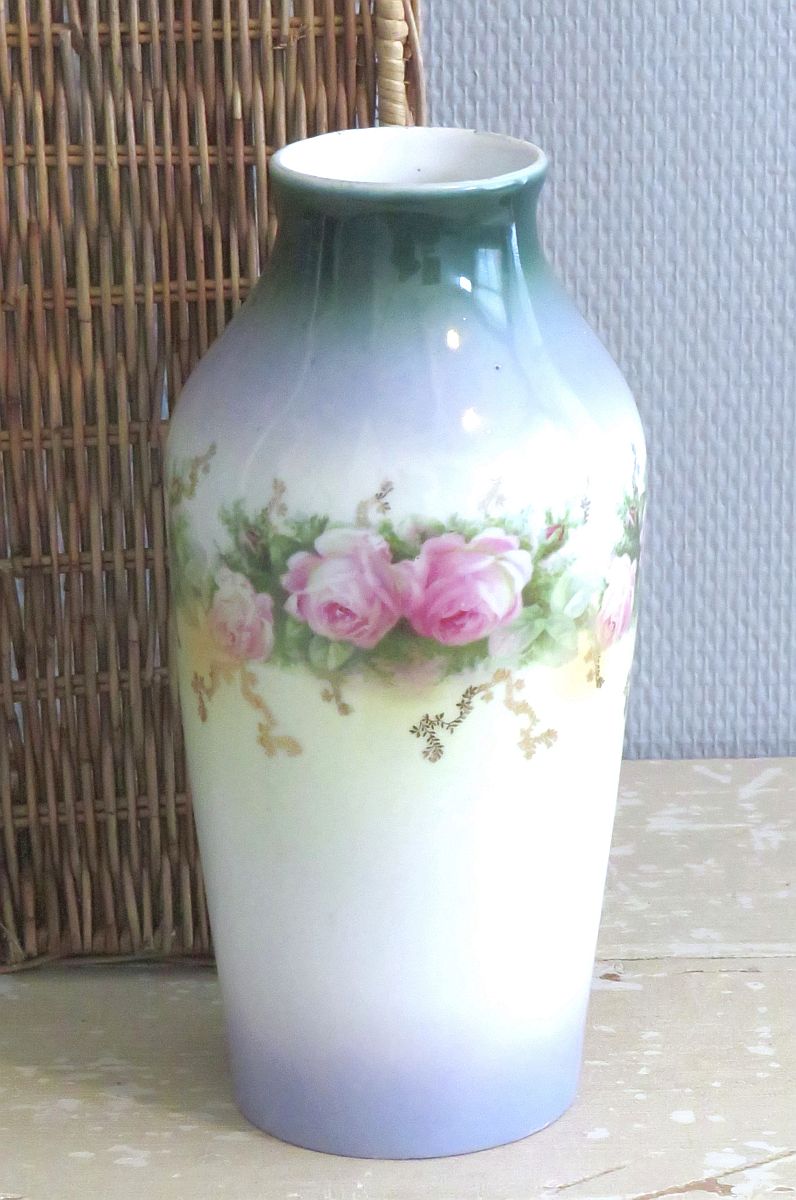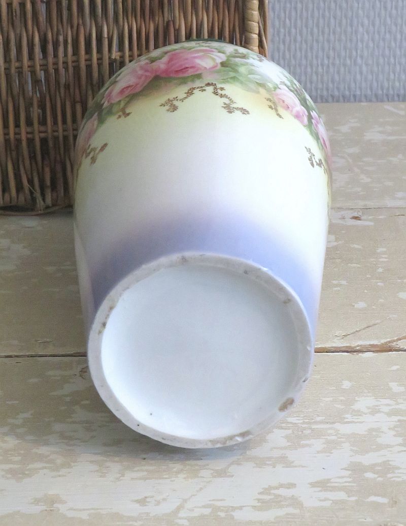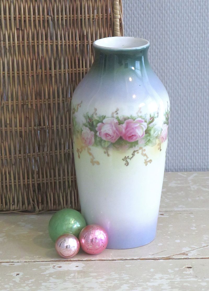 Oude porseleinen vaas met rozendecoratie in pasteltinten en goud.