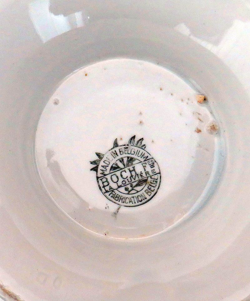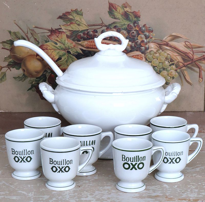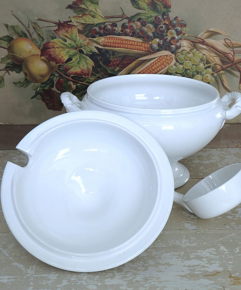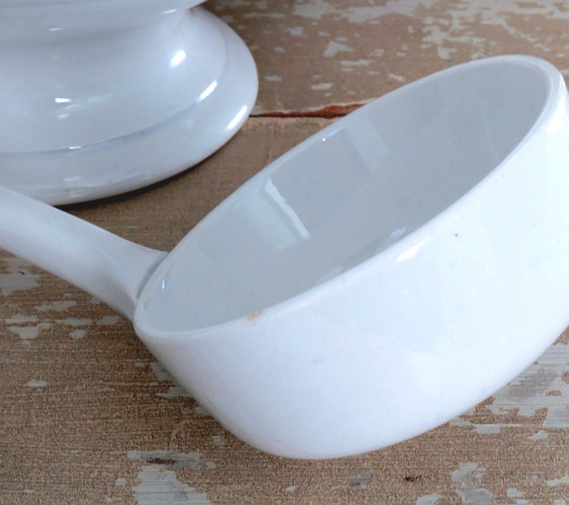 Oude grote witte terrine van Boch met keramische soeplepel.