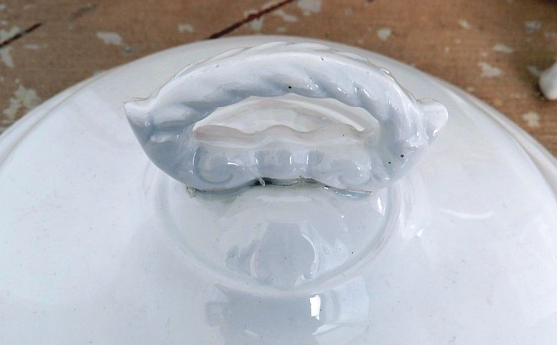 De terrine is in goede conditie, een fleebite en het lijkt of de knop in het verleden is gelijmd (bijna niet te zien).