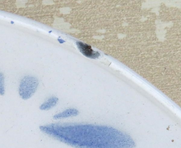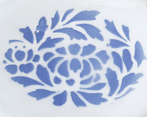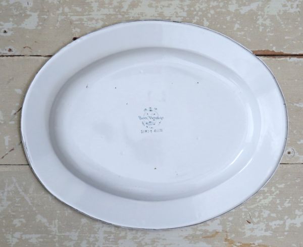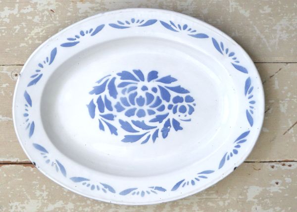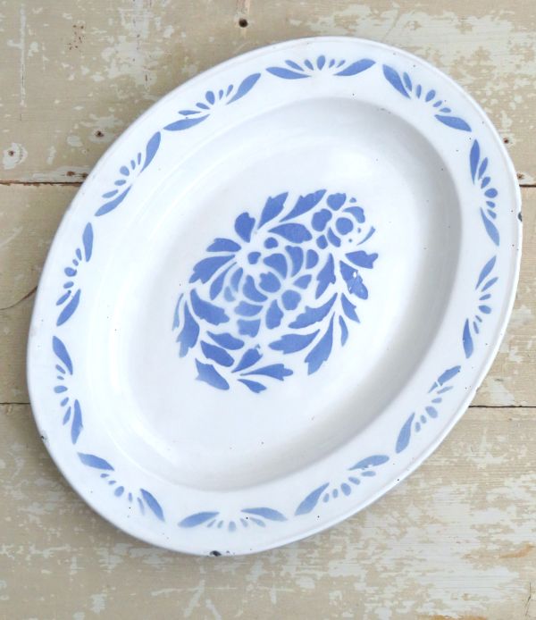 Ovale emaille schaal met blauwe bloemen (spuitdecor).