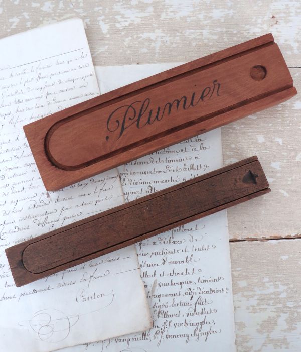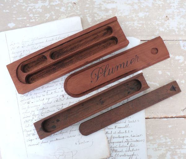 Set van een houten oude griffeldoos en een Frans pennenbakje “Plumier.