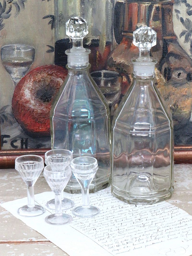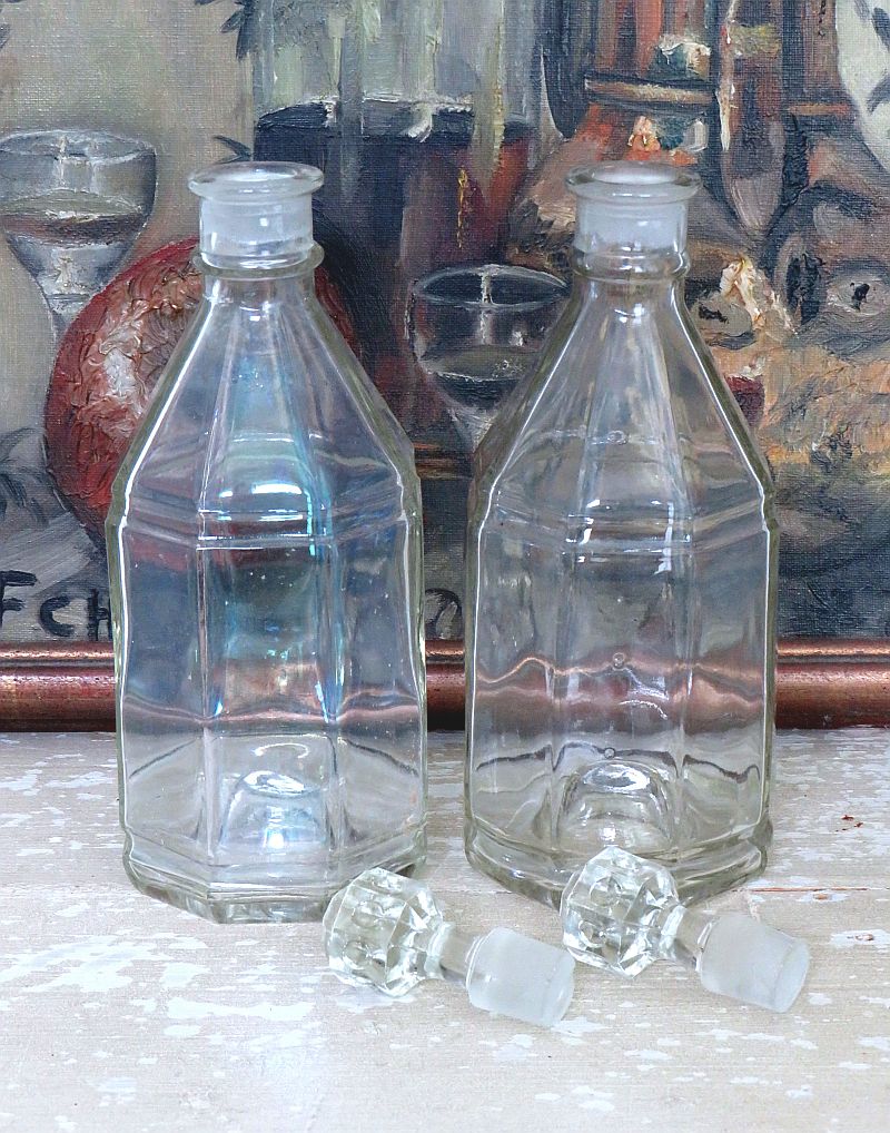 Set van 2 oude achtkantige flessen / karaffen met stop.