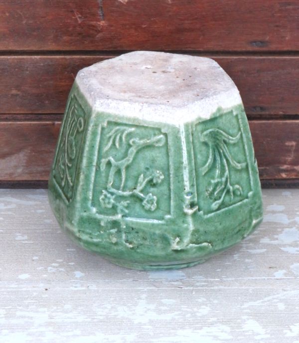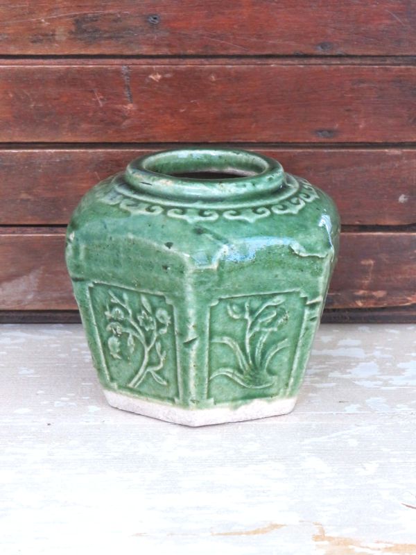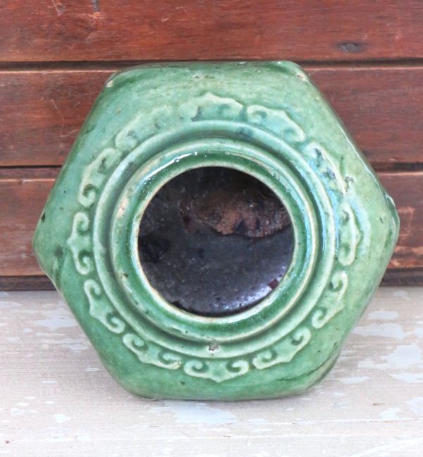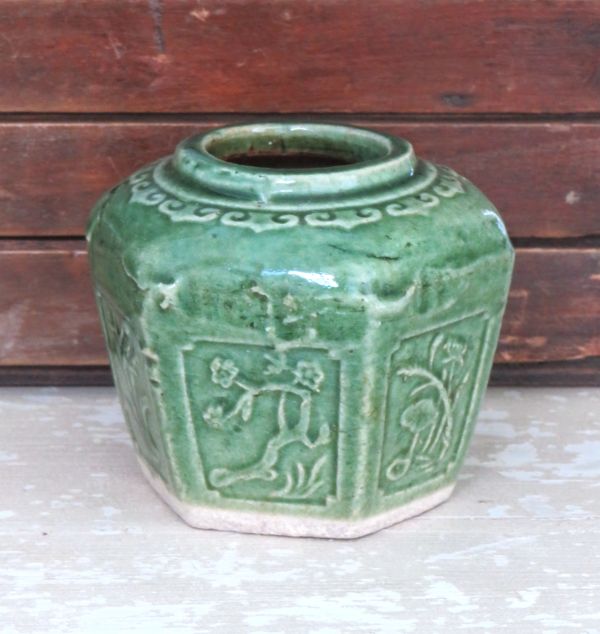 Vintage groene gemberpot. Afmeting 11,5×10,5cm, hoogte 9cm. In goede conditie, zie foto’s.