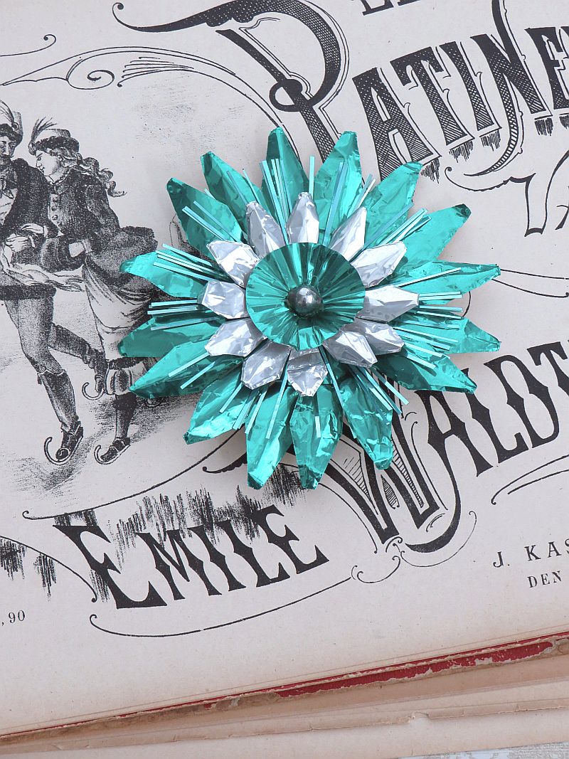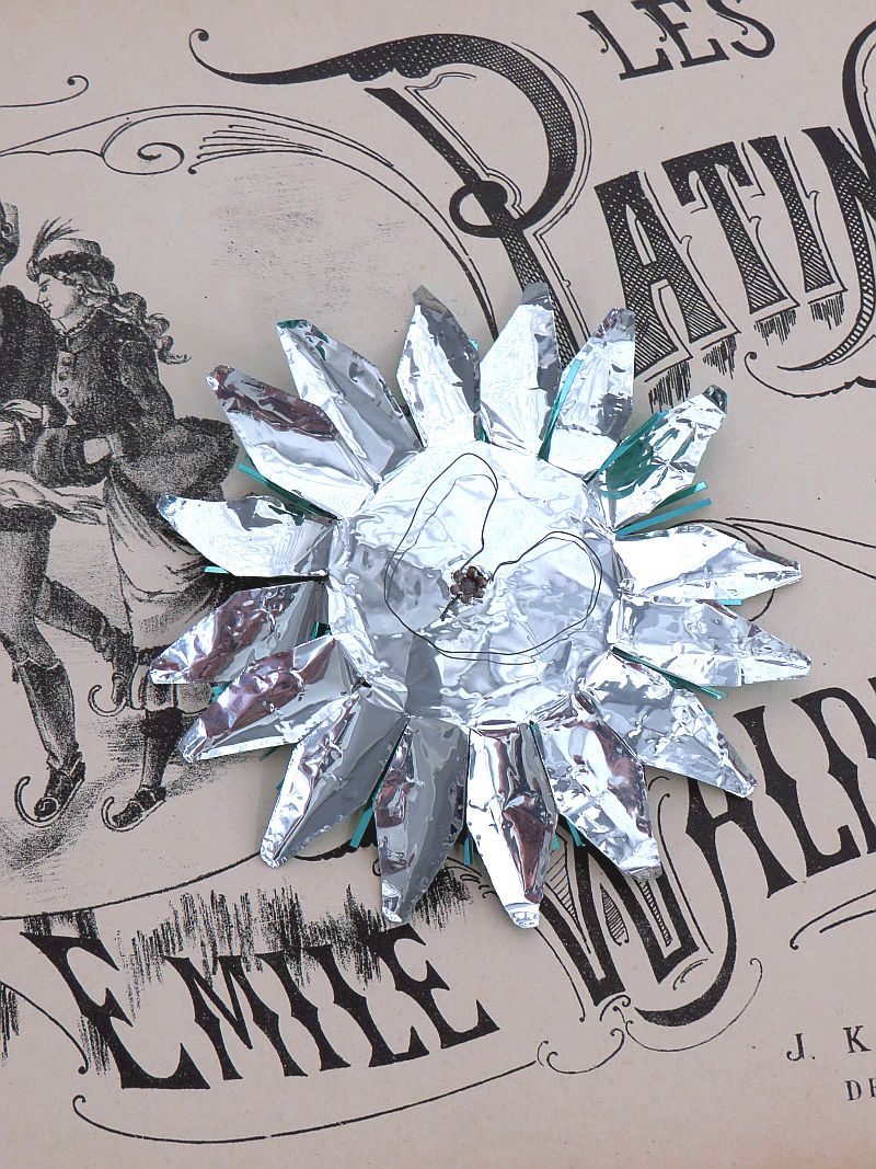 De blaadjes zijn gemaakt van metaalfolie en het hartje van een glazen kerstballetje.